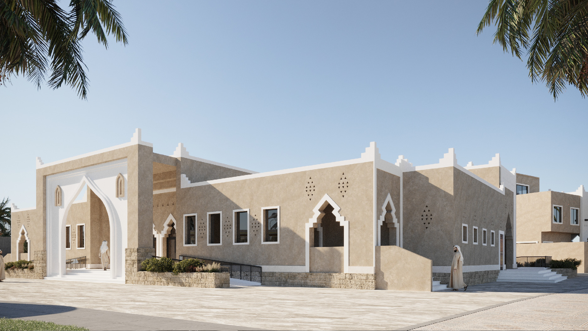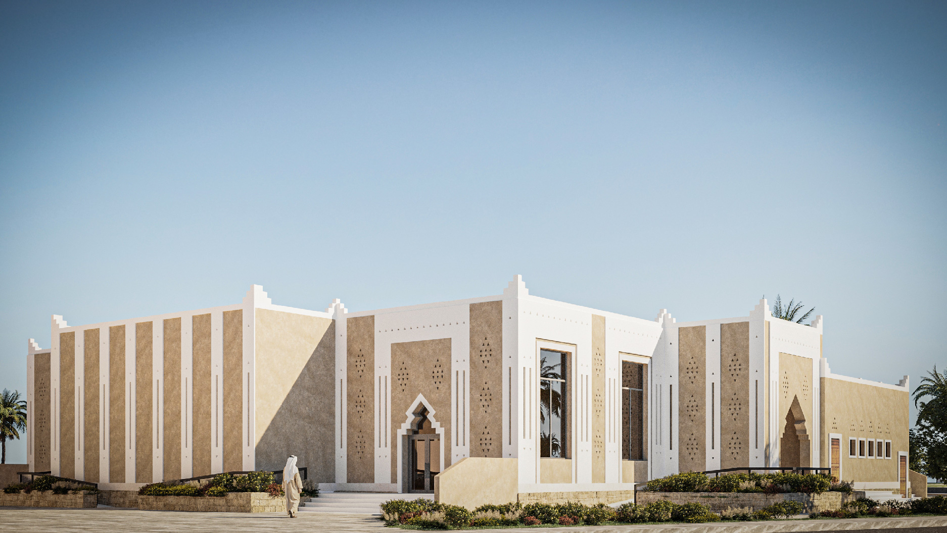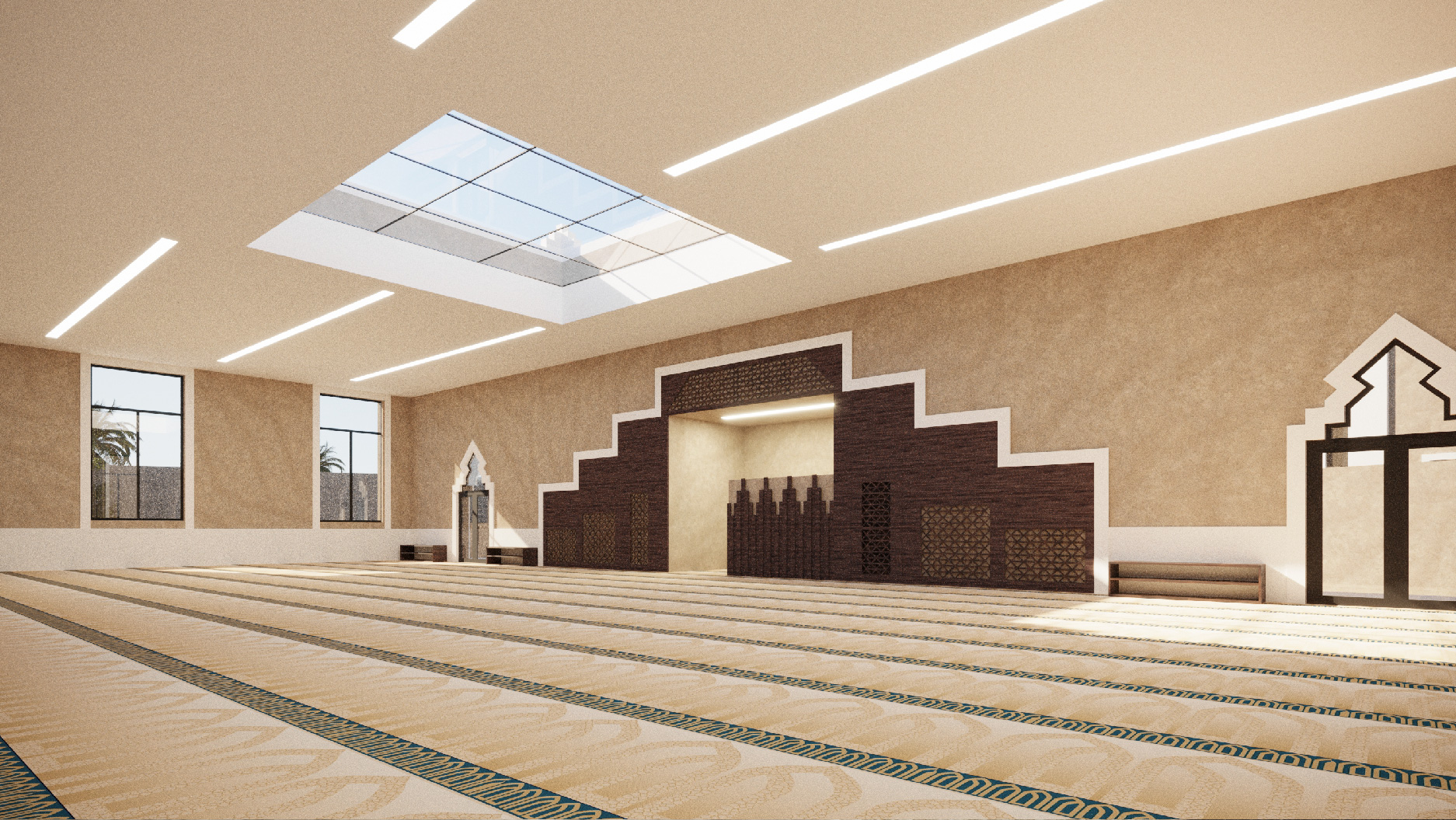 The architectural concept draws inspiration from classical Islamic motifs, reinterpreted through a modern lens. The exterior features elegant geometric patterns and arched doorways that pay homage to traditional masjid architecture, while the clean lines and expansive glazing introduce a sense of openness and light.